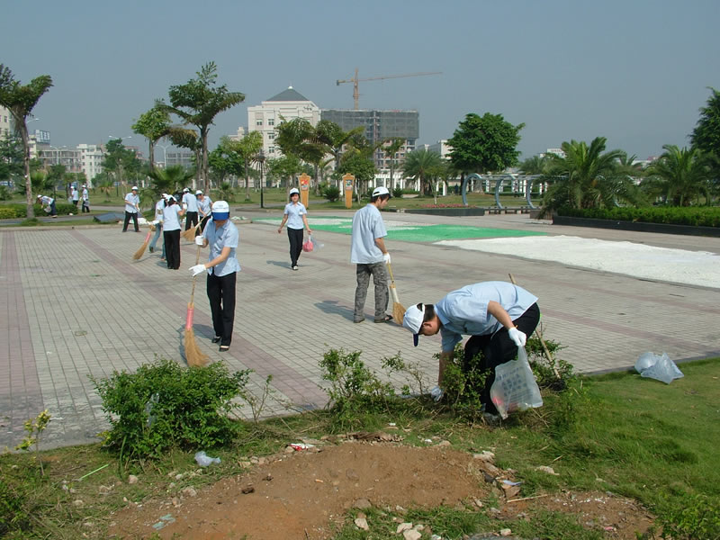 广场上绿荫如盖、绿草如茵,是居民们煅炼、休闲的好去处。但也正因为游人如织,草地上、灌木丛中,塑料袋、塑料杯、矿泉水瓶、西瓜皮、卫生纸等无处不在。长江集团的青年志愿者们张挂好宣传条幅,顶着仲夏的烈日,汗流浃背地拾拣垃圾。尤其这些平时打扮得清清爽爽、喜爱干净的女孩们,此刻却连已经腐败的西瓜皮也敢于直面,毫不手软。