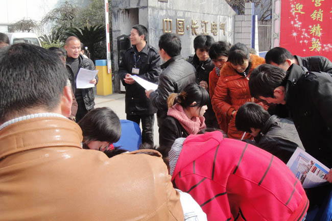 本报讯 “个人简历表格给我一份,我要应聘!”,“早就听说你们长江员工生活、福利待遇都很不错,我有好几个老乡在你们那里,我也要应聘!”由于集团业务的不断发展,生产规模不断扩大,现有人力已无法满足发展所需,农历正月初四至元宵节期间,长江集团人力资源部组织员工分为5组在虹桥、柳市、白象等地大型工业区及乐清经济开发区同步进行招聘,这是笔者在集团门口招聘现场看到的一幕(如下图所示)。据悉,长江集团此次新春招聘以扩充一线生产员工队伍为主要目的,受到了外来求职者的热情关注(招聘信息详询集团人力资源部0577―61726107)。